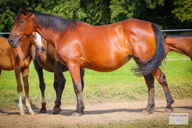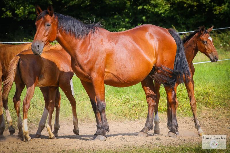 Belle jument avec du coffre, de la force et une souche alliant savamment le meilleur père belge Nabab de Reve et Esmeralda des Landes par O'malley. Un coup de sang original dans l'élevage Champeix.